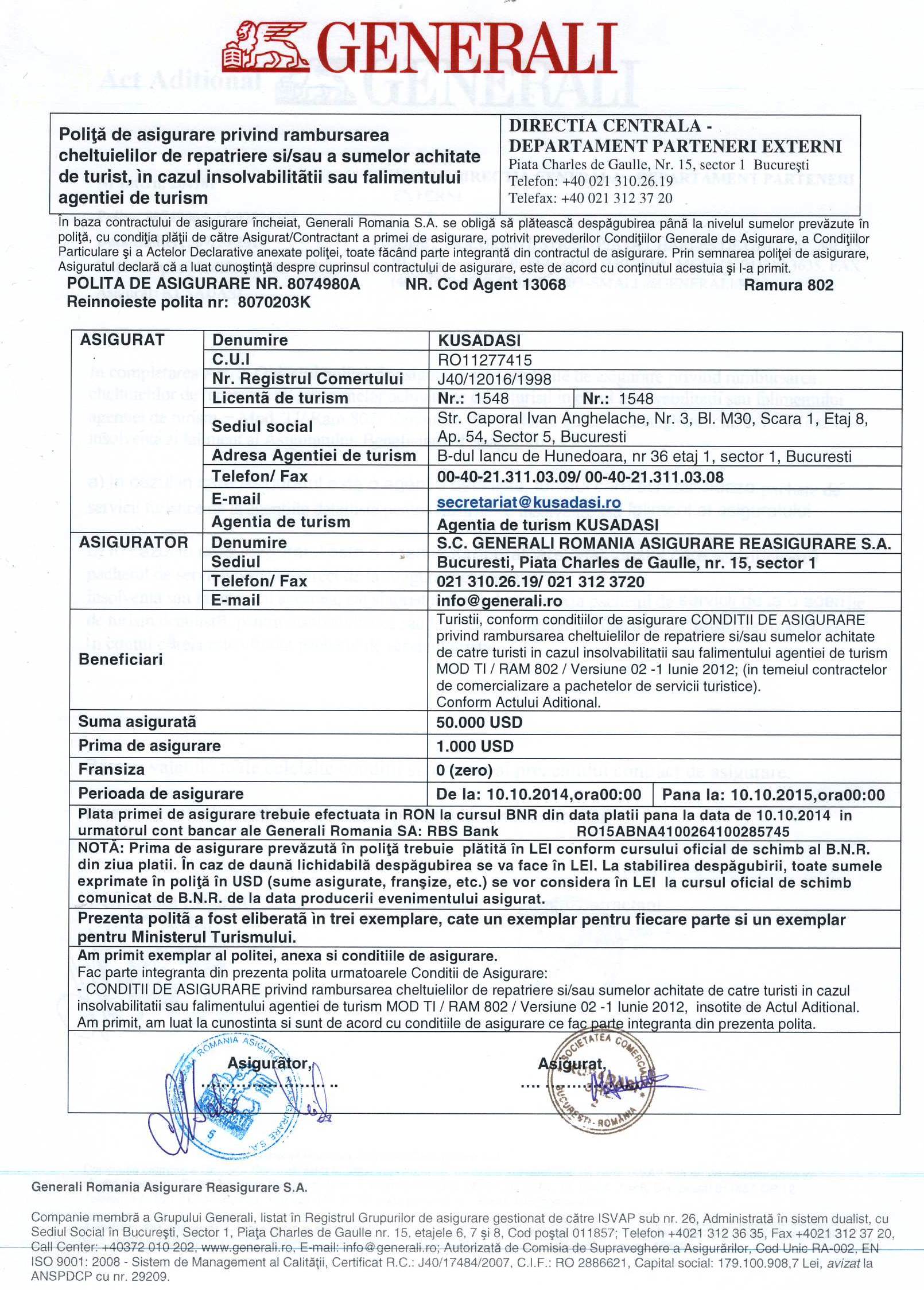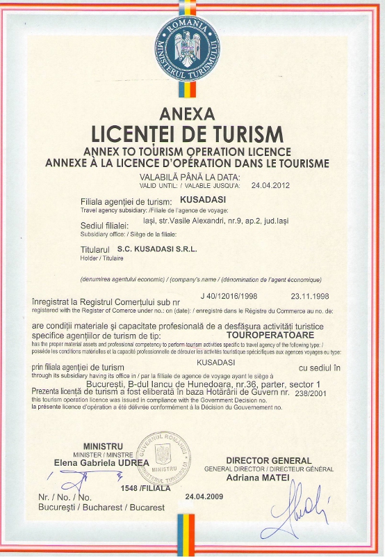 "KUSADASI" este o agentie de turism tour-operatoare infiintata in 1999, membra A.N.A.T. si C.C.I.R. In toti acesti ani am incercat prin pregatirea personalului sa ridicam cat mai mult calitatea serviciilor oferite.