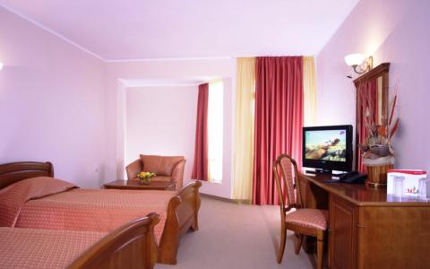 Standard double Room(30mp): ofera un balcon spatios; 2 paturi single sau 1 pat queen size si o canapea extensibila (ce reprezinta patul pentru a 3-a persoana cazata, daca este cazul); aer conditionat; TV cu programe prin satelit; conexiune la internet prin cablu; baie cu cabina de dus si cada, uscator de par.