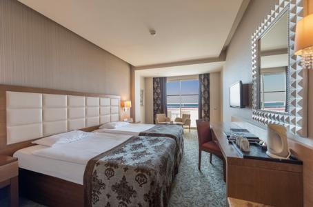 Camera deluxe cu vedere la mare are 24 mp si urmatoarele facilitati: 2 paturi, balcon, Tv, birou, seif, telefon, aer conditionat, baie cu cada sau dus, uscator de par, minibar, serviciu de trezire. Camerele sunt repartizate pe toate etajele hotelului ( de la parter pana la ultimul etaj, asadar vederea la mare poate fi partiala sau totala). Mentiune: pentru camerele in regim triple (3 adulti) sau camere double (2 adulti si 1 copil): vor fi 2 paturi single si un pat extensibil.