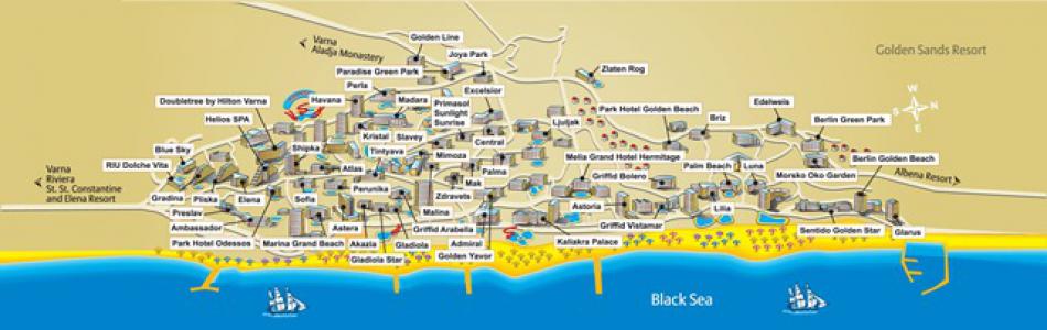 Statiunea Nisipurile de Aur este situata la 17 km, la nord de orasul Varna. Datorita frumusetii naturii, clima propice, nisipul fin si auriu si izvoarele termale, statiunea Nisipurile de Aur este socotita perla litoralului bulgaresc.