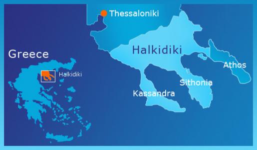 Halkidiki se afla in nordul Greciei si este compusa din 3 brate – Kassandra, Sithonia si Athos. Cu o linie de coasta ce se intinde pe o distanta de 522 km, ale carei plaje variaza atat ca forme, cat si ca dimensiuni, de la plaje lungi cu nisip fin, la plaje mici, la golfuri pitoresti, porturi mici, sate traditionale pescaresti.
