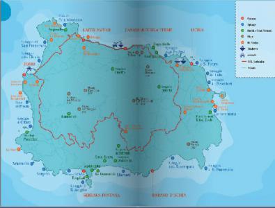Insula Ischia este împărțită în 6 zone, fiecare renumită pentru frumusetile sale: Ischia, Barano d' Ischia, Serrara Fontana, Forio, Lacco Ameno, Casamicciola Terme.